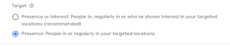 Location Targeting is just the same as any other Google Ads campaign. After selecting your targeted locations, I recommend selecting the Presence: People in or regularly in your targeted locations radio button too.